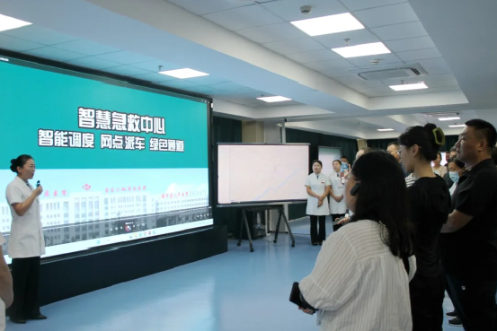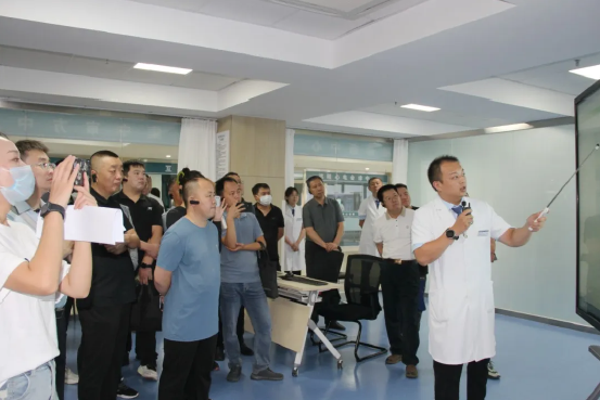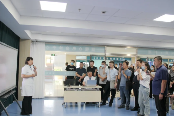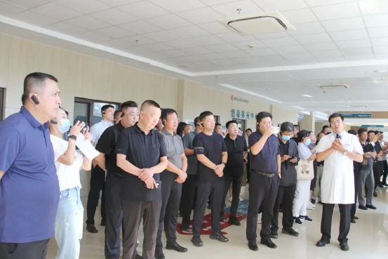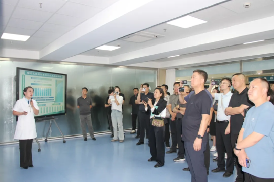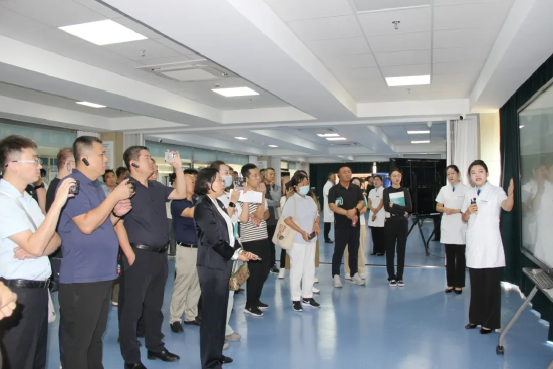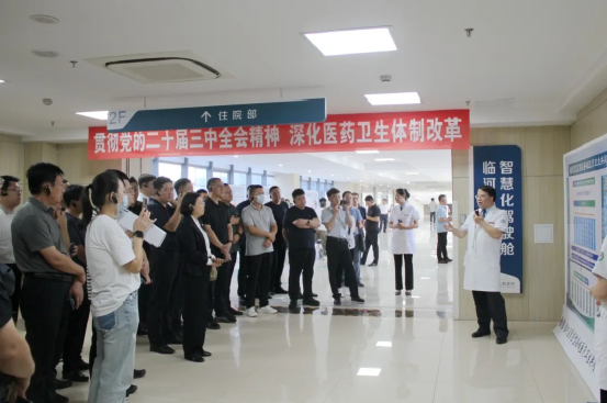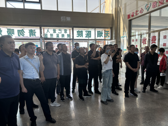 在医技楼一楼大厅,参观人员听取临河区紧密型医共体建设总体情况的介绍。