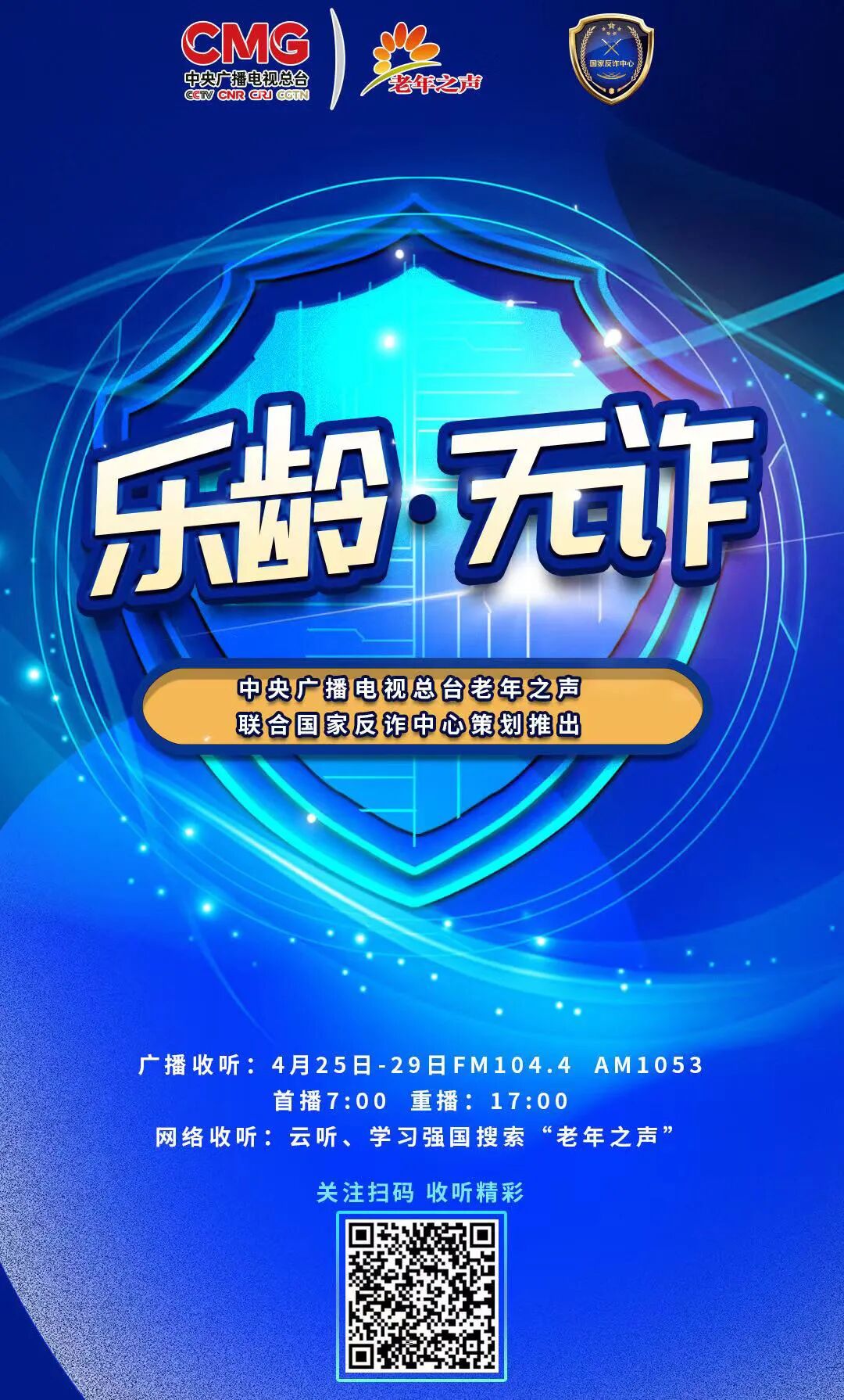 为贯彻落实习近平总书记关于老龄工作和打击治理电信网络诈骗工作的重要指示批示,进一步提高广大老年人识骗、防骗能力,4月25-29日,国家反诈中心联合中央广播电视总台老年之声栏目推出5集反诈系列节目《乐龄·无诈》,针对老年人高发新型典型电信诈骗类型,以案说法、套路拆解、深入分析、提出对策。为老年人筑牢反诈“防火墙”,守护最美“夕阳”。收听电台:FM104.4、AM1053,首播7:00;重播:17:00;网络收听:云听、学习强国搜索“老年之声”。